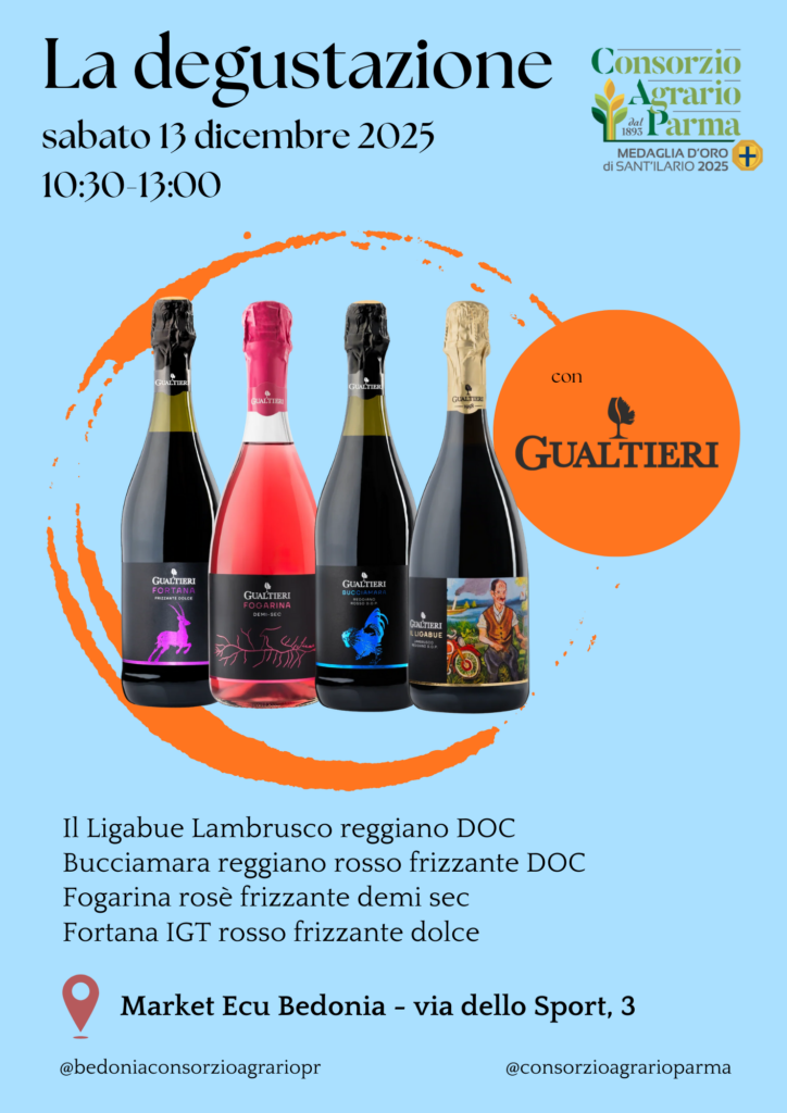 Si chiude la serie di degustazioni del Consorzio Agrario Parma con l’appuntamento al market Ecu di Bedonia con la cantina Gualtieri. La selezione di Il Ligabue Lambrusco reggiano DOC, Bucciamara reggiano rosso frizzante DOC, Fogarina rosè frizzante demi sec e la Fortana IGT rosso frizzante dolce si è confermata vincente anche in Val Taro!