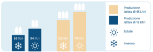 Figura 1: Il fabbisogno di acqua varia in base alla produzione lattea e alla temperatura ambientale. In estate quando le temperature sono elevate il consumo è maggiore.